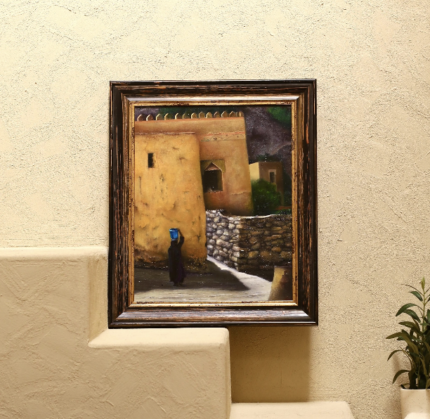 About this artwork. The painting tells the story of generational continuity through the history of a small house where several generations of one family live in the village of Hadash, hidden among the rocky ridges of the Hajar mountain range. This family nest is the fruit of the labour of those who have lived there, and it will undoubtedly reflect the efforts of future generations as well.
